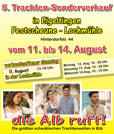 Am Sonntag, 11. August öffnet nun bereits zum fünften mal unser Trachten-Sonderverkauf in Eigeltingen / Lochmühle die Pforten. Vier Tage vom 11.-.14. August 2019 steht der Sonderverkauf ganz im Zeichen der "Tracht".